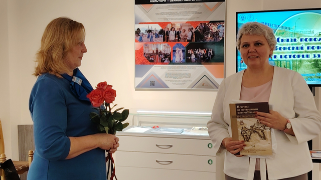 Встреча завершилась интересной экскурсией по экспозиции выставки «Почетные граждане г. Полоцка». Особое внимание Ирина Воднева уделила заслугам работников Полоцкого завода стекловолокна. Среди отмеченных почетных граждан, чьи имена вписаны в историю нашего города, — руководители Яков Борисов, Лидия Григорьева, крутильщица Ольга Кундалевич.